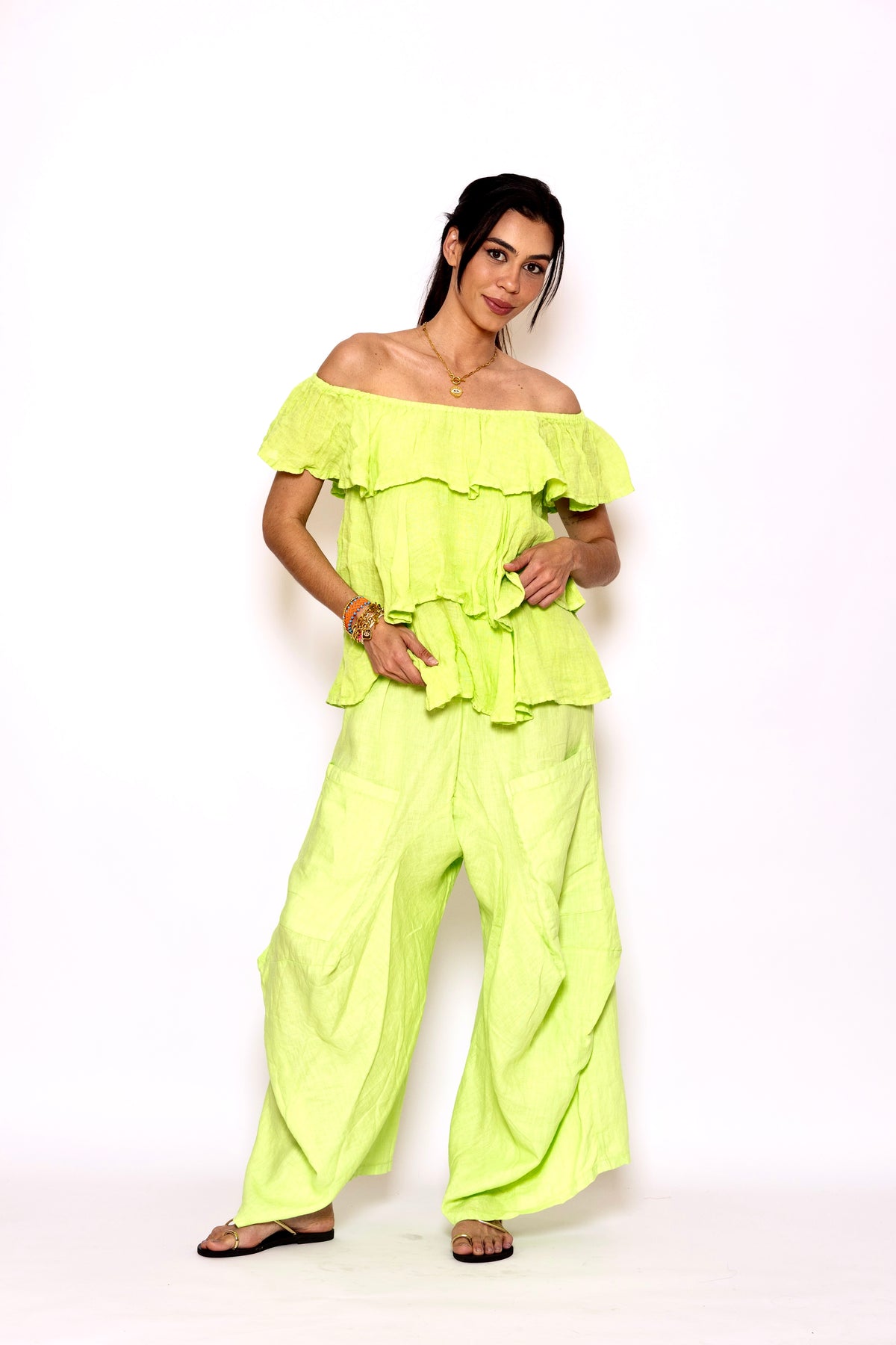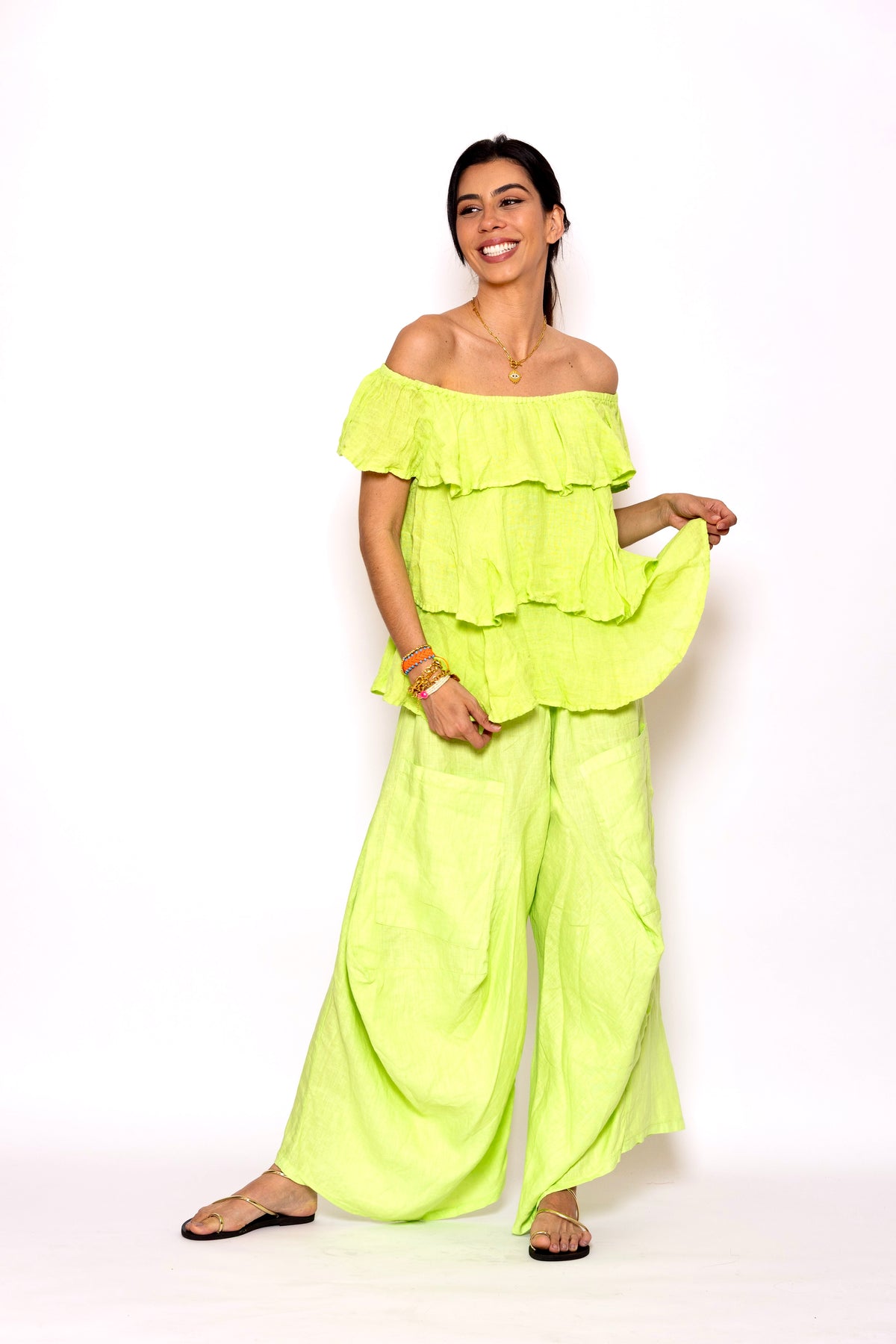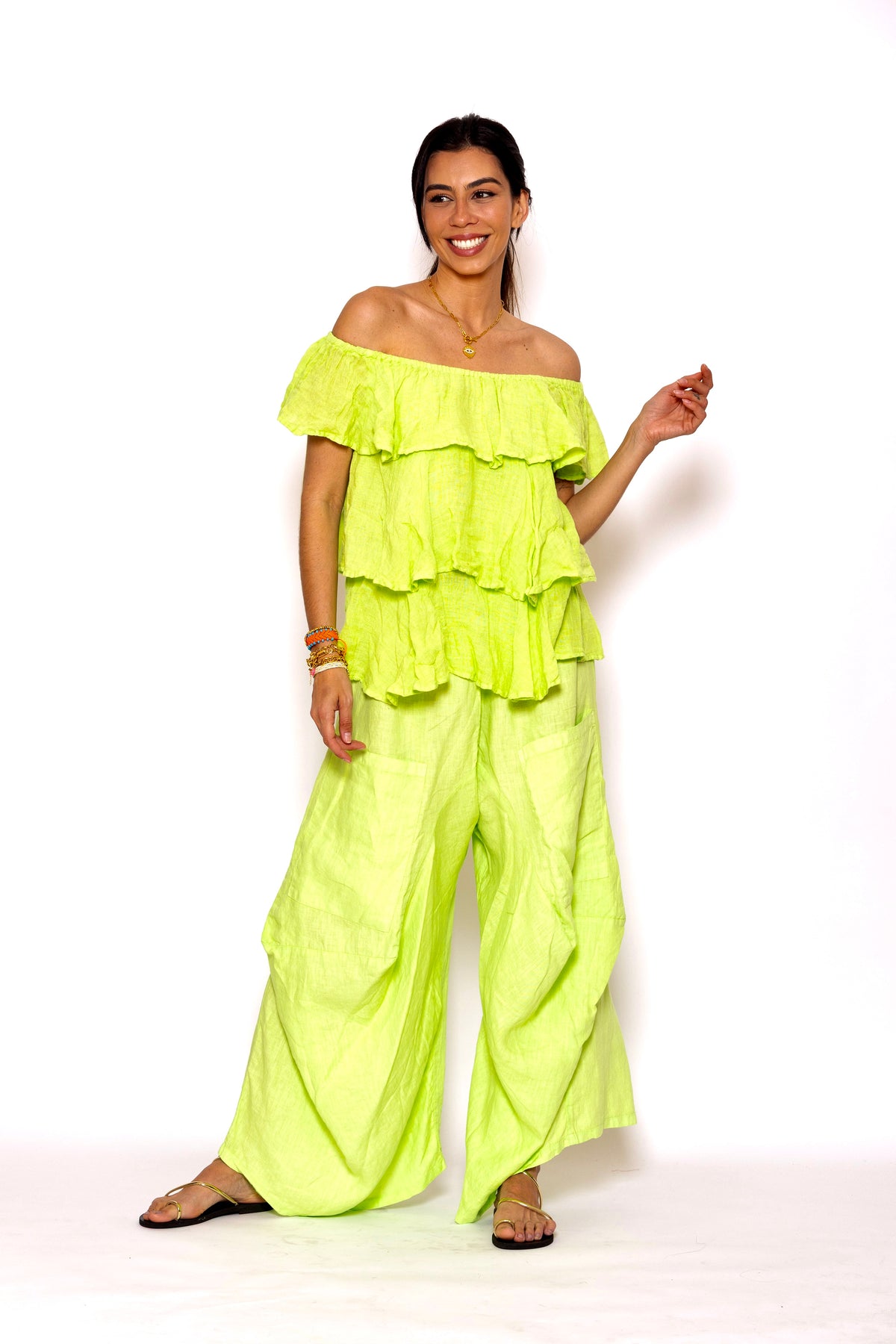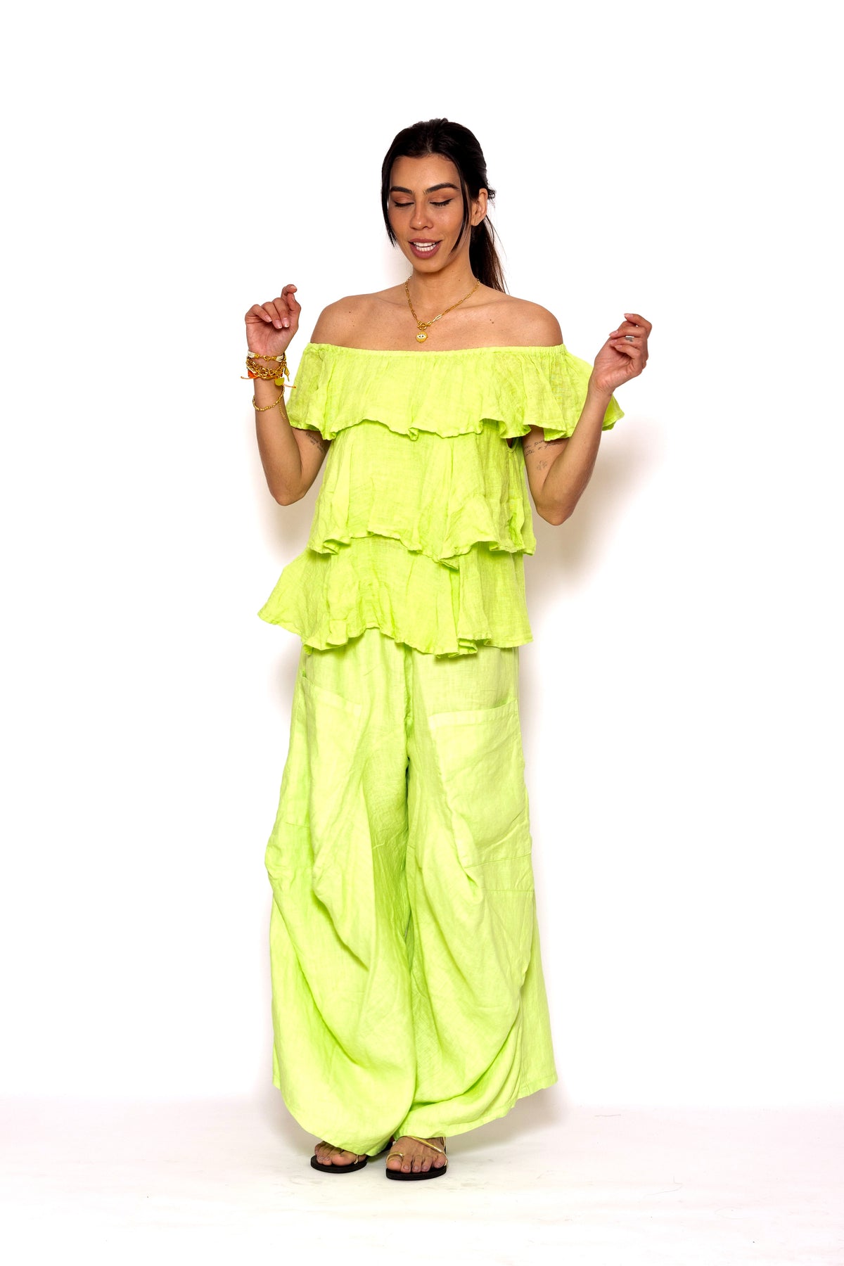 Light up your summer in Flamenco Fiesta — a joyful duet of colour and comfort. This breezy, off-the-shoulder layered top crafted from soft linen gauze brings effortless movement and feminine flair, while the wide-leg linen pantaloon pants float with every step.